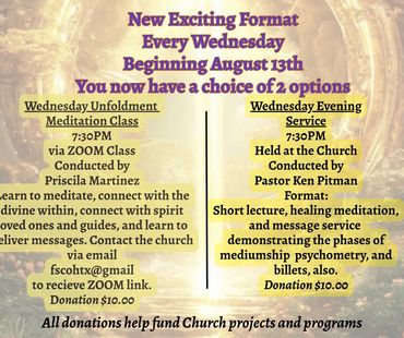 Service includes prayer, inspirational talks, healing meditation, & spirit communications.