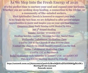 Service includes prayer, inspirational talks, healing meditation, & spirit communications.